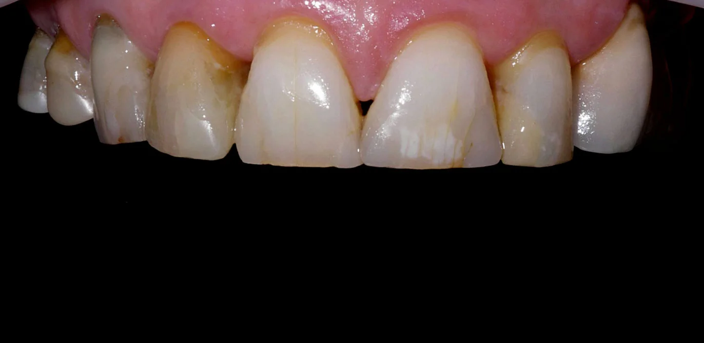 Þessum lit er nánast ómögulegt að ná burt með lýsingu og verðum við að hreinsa litinn upp með verkfærum og bæta sprunguna með tannlituðu fyllingarefni eins og gert var í þessu tilviki.