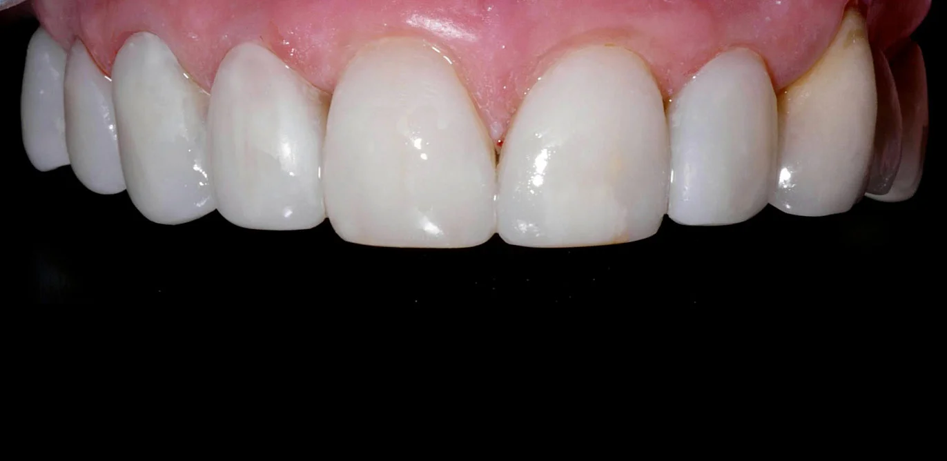 Hér var ákveðið að gera skeljar úr tannlituðu fyllingarefni til að bæta útlit, spara tannvef og kostnað. Hér er ekkert tekið af eigin tönn einingis bætt við, þannig reynum við að varðveita sem mest af eigin tönn.